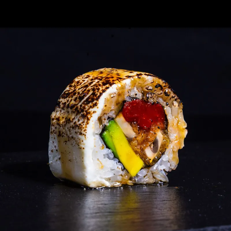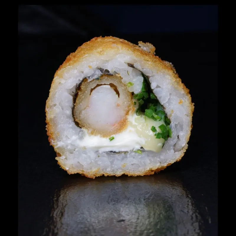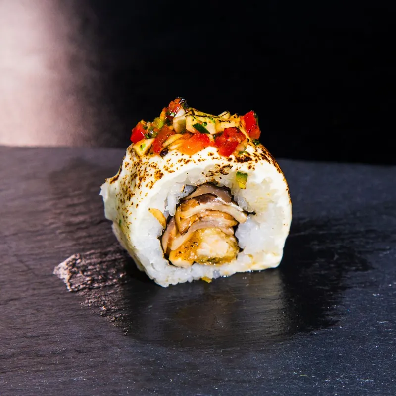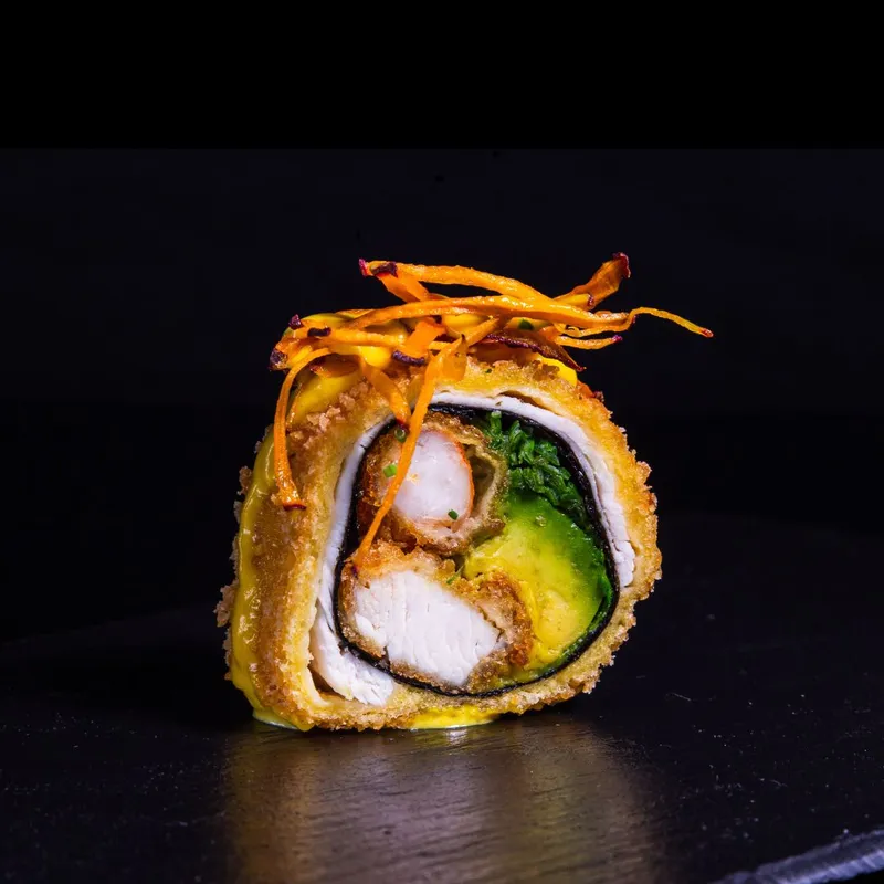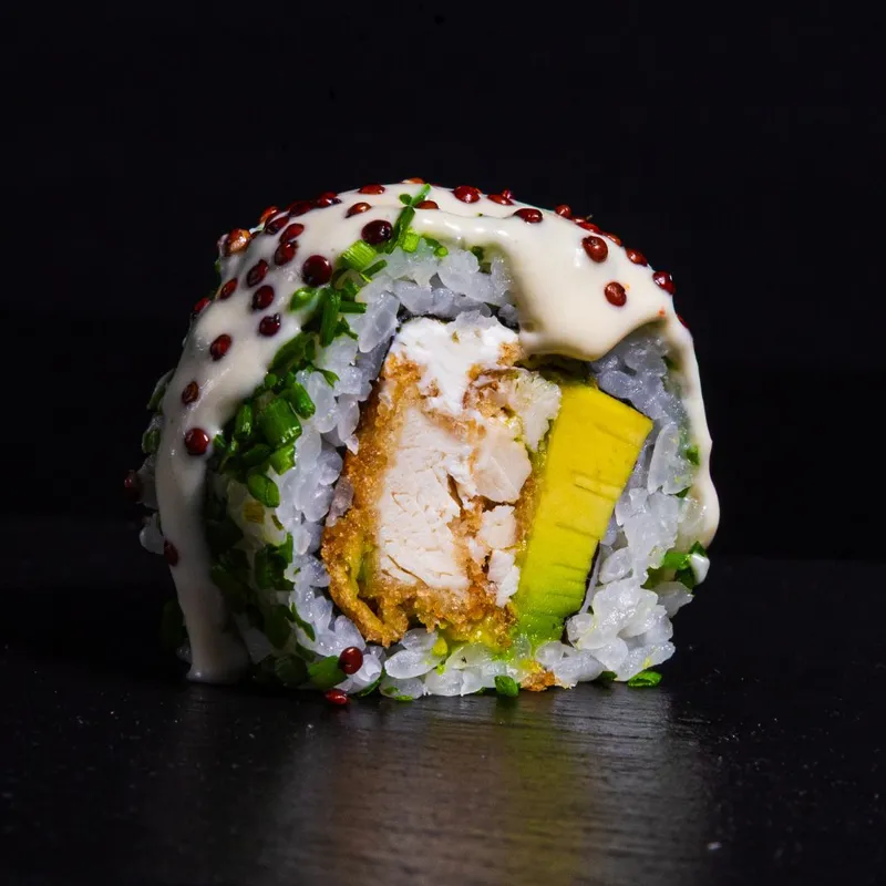 Pollo furai, champiñón salteado, queso crema, y cebollín, envuelto en pollo apanado y salsa teriyaki.