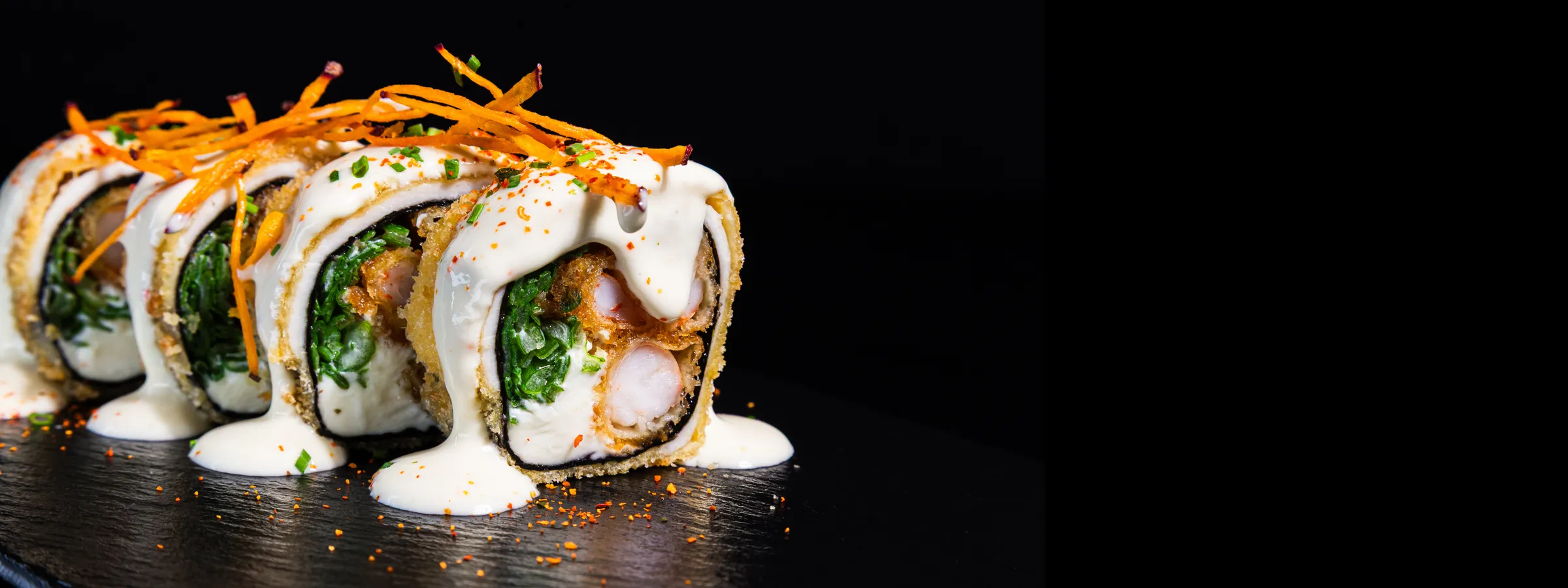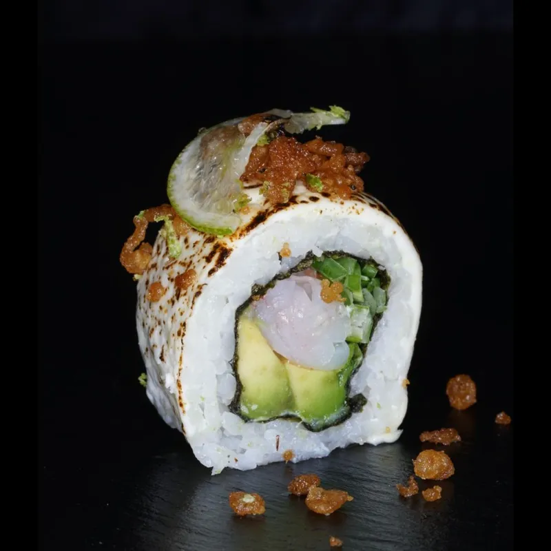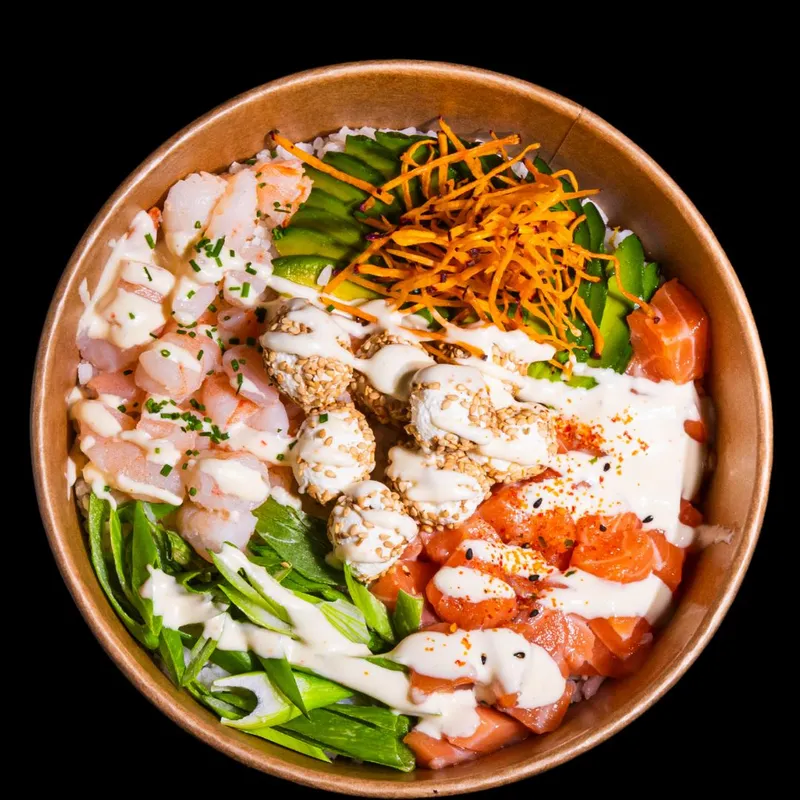 Base arroz, tartar de salmón, camarón furai, palta, queso crema con salsa acevichada.