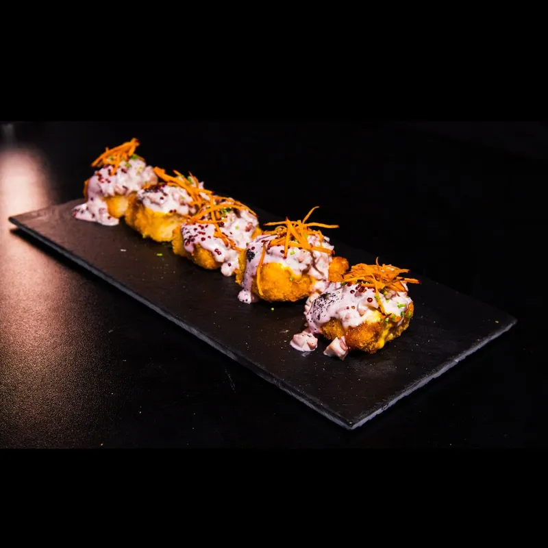 Palta, queso crema, apanado en panko, cubierto de tartar de atún y salsa acevichada con quinoa crunch.